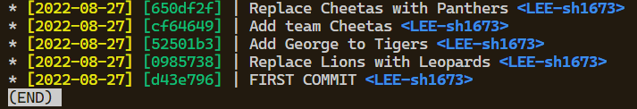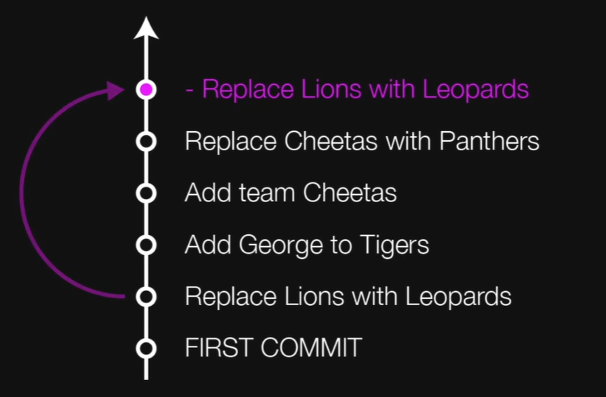위 히스토리에서 "Replace Lions.." 의 커밋에 revert를 사용하면 작업한 내용을 취소하면서 아래 그림과 같이 취소했다는 사실이 새로운 커밋으로 남게 된다.